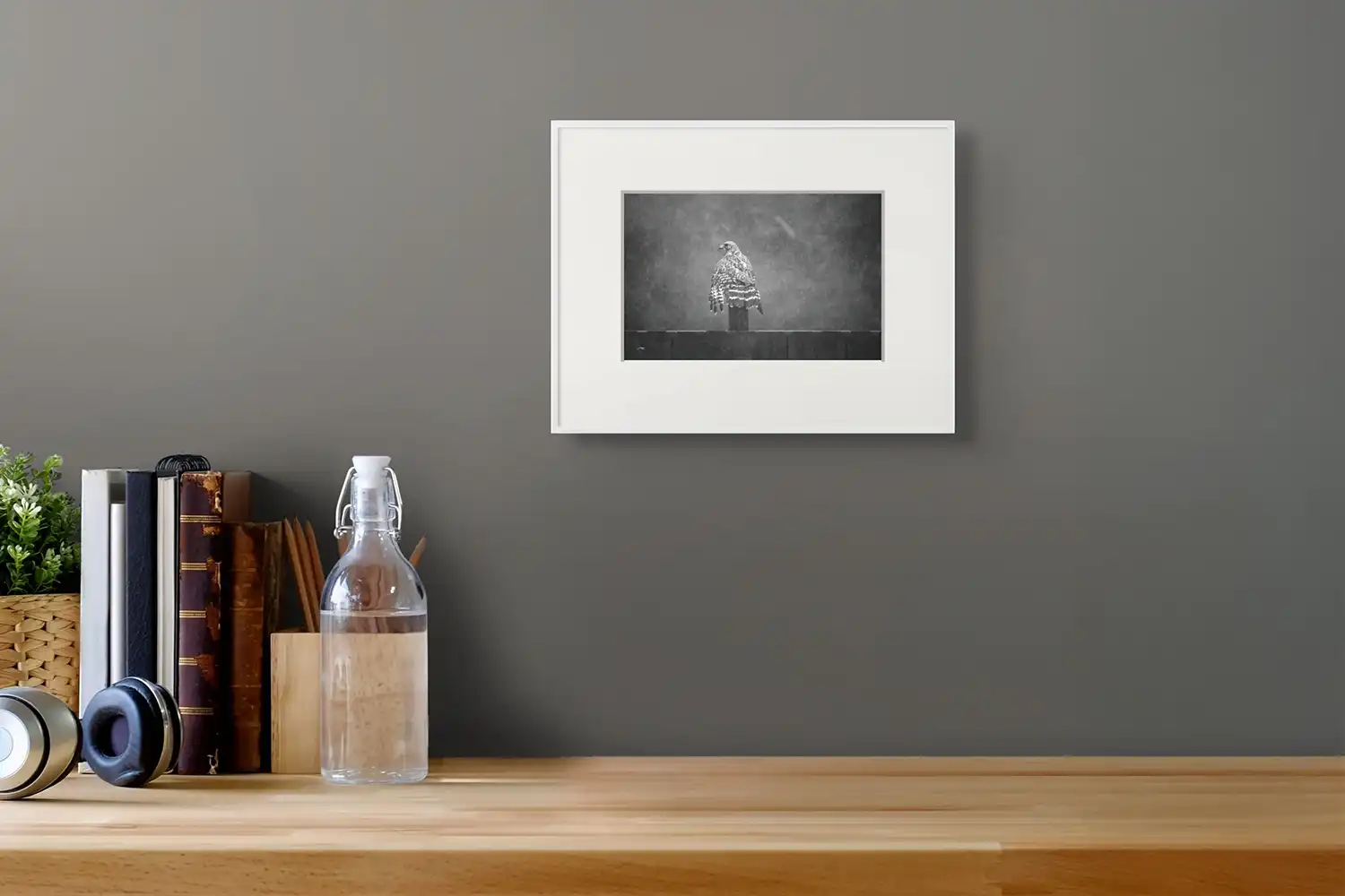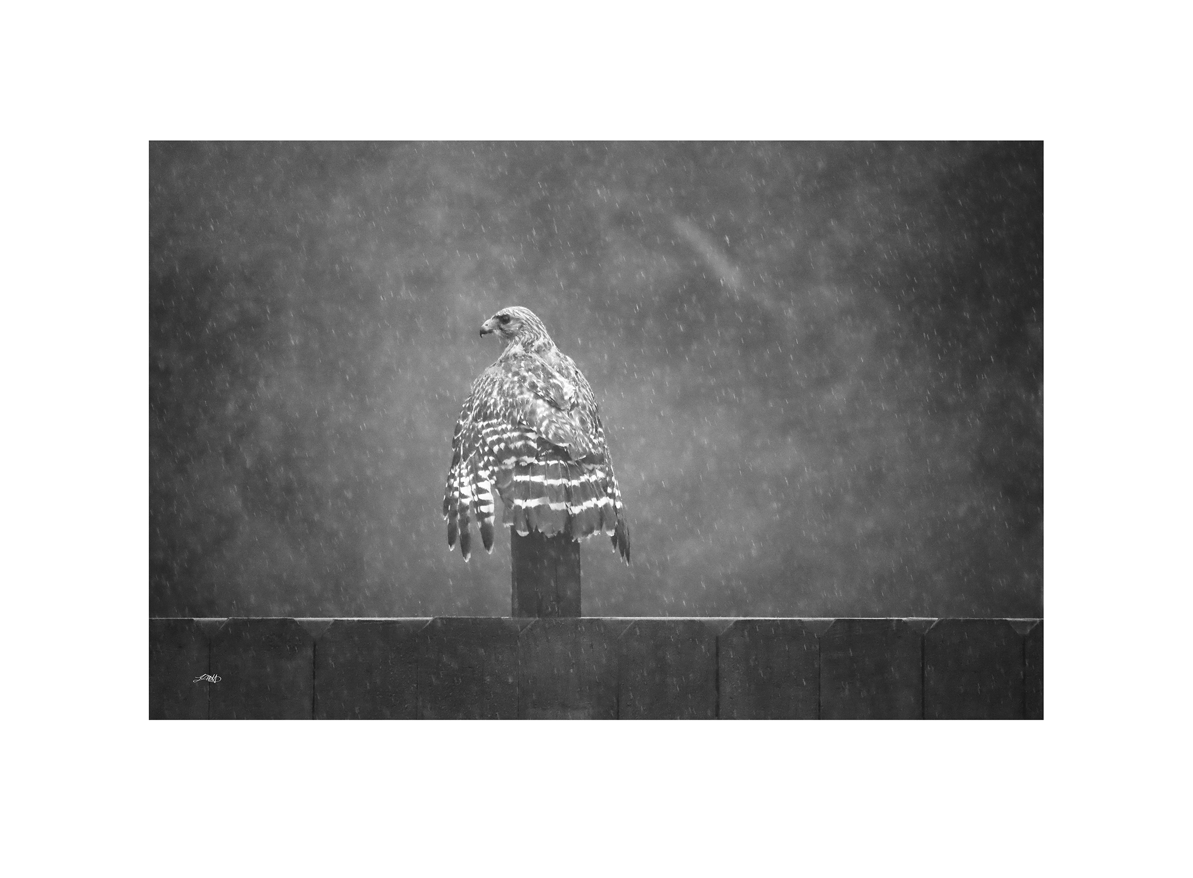 Back Feathers II displays the hawk’s dramatic pose between the light and dark contrasts of a serene atmosphere.