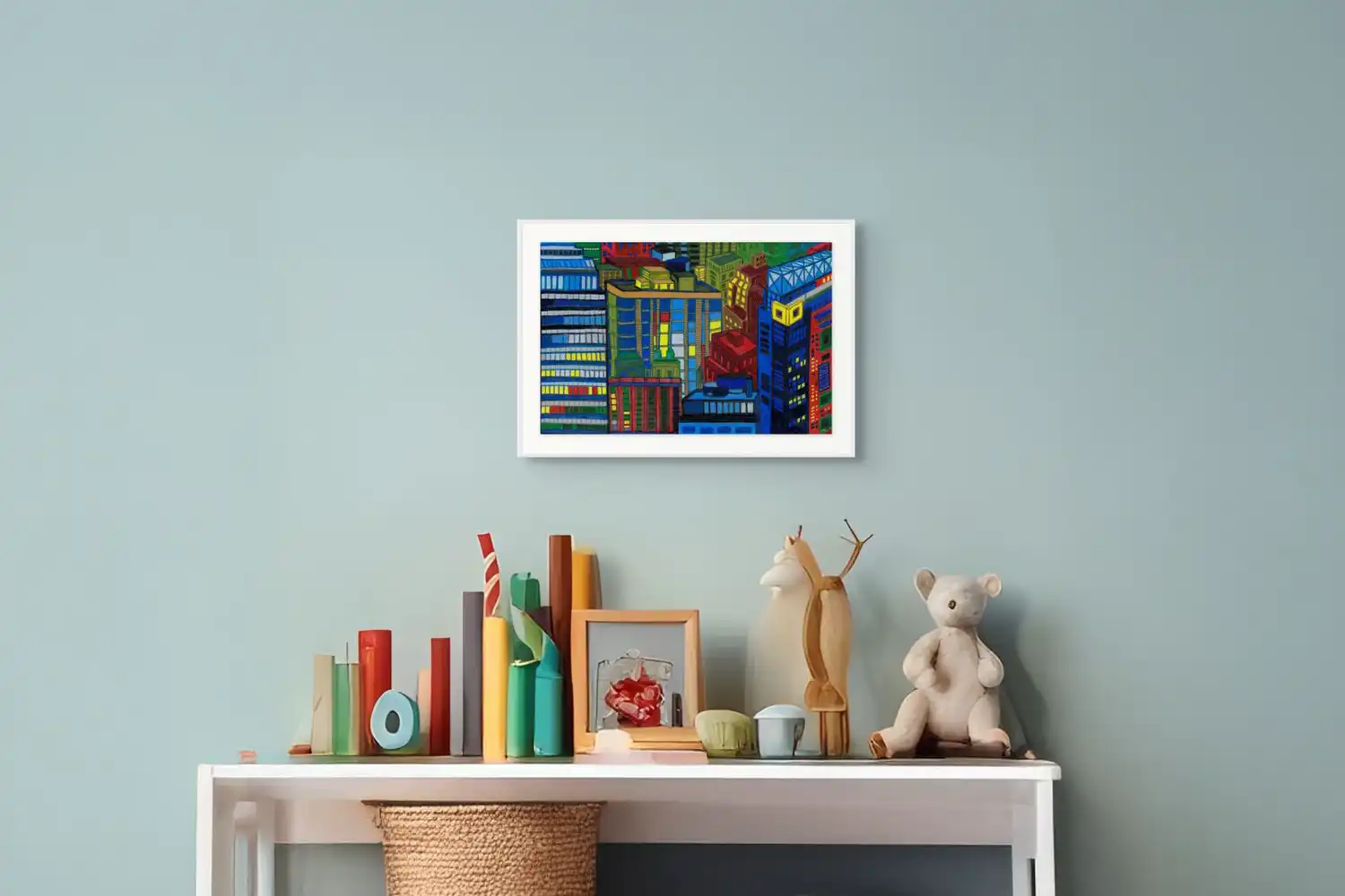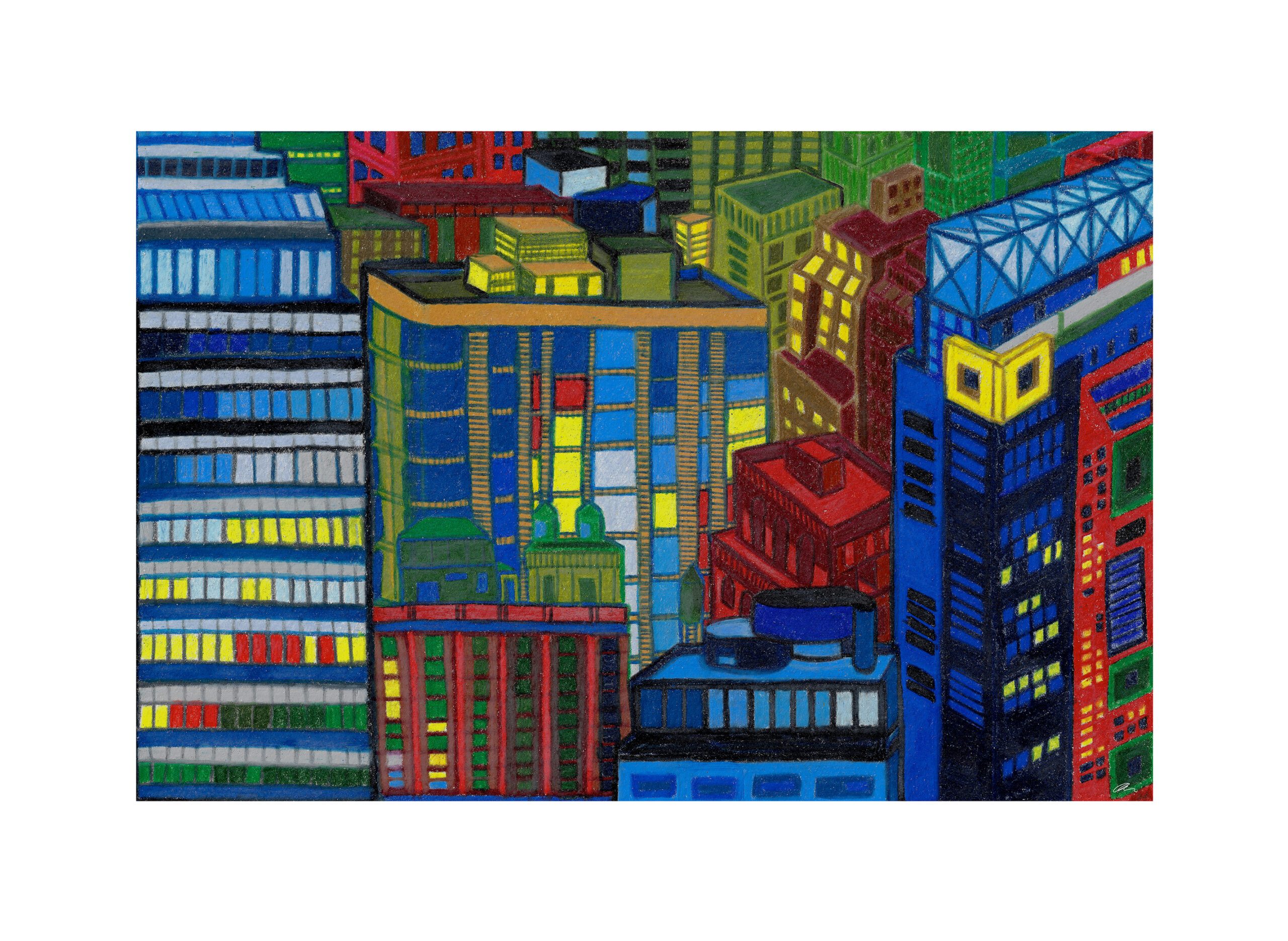 Candy Lights II incorporates more of the yellow tones as if they are musical notes playing from structure to structure. Each portion brightens the city skyline and contrasts the solid styles of architecture on the horizon.