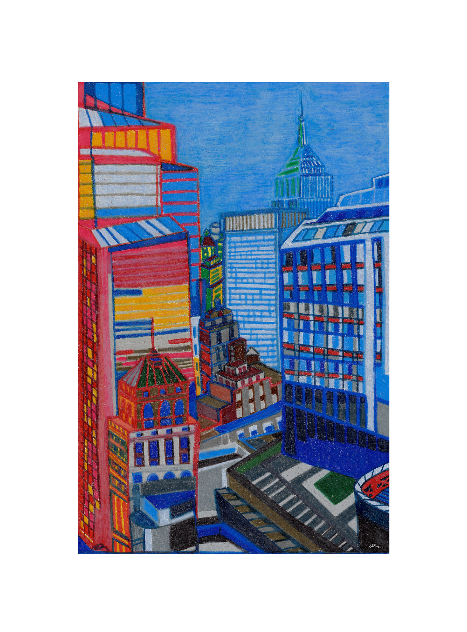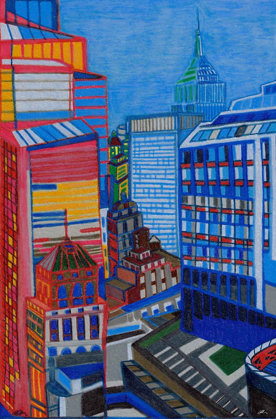 Candy Lights is a colorful night view of the city skyline. The piece highlights the architectural features as I saw them juxtapose against the diversity of structures. It invites the eye to explore the shapes, bright colors, and tones in the composition.