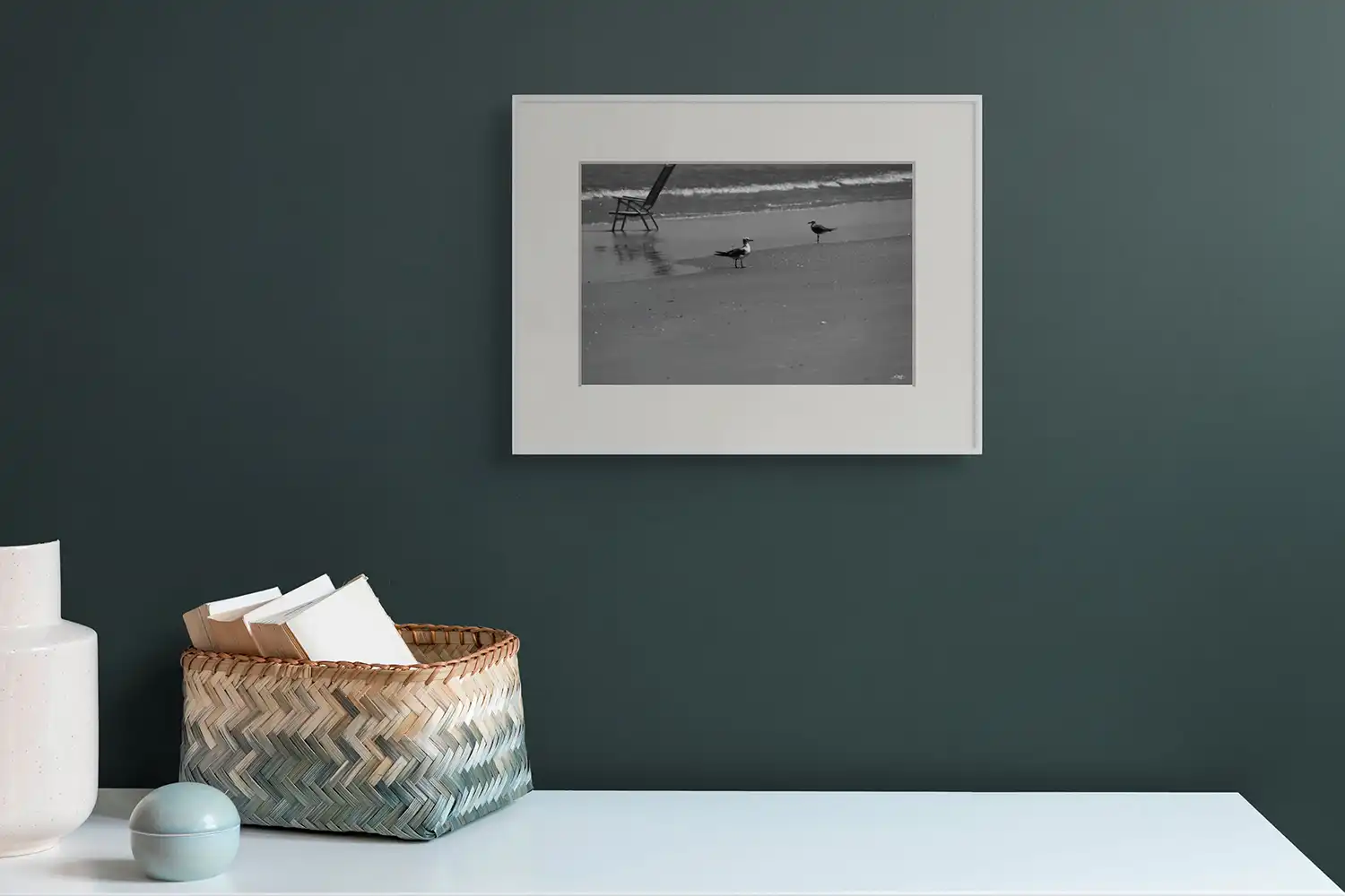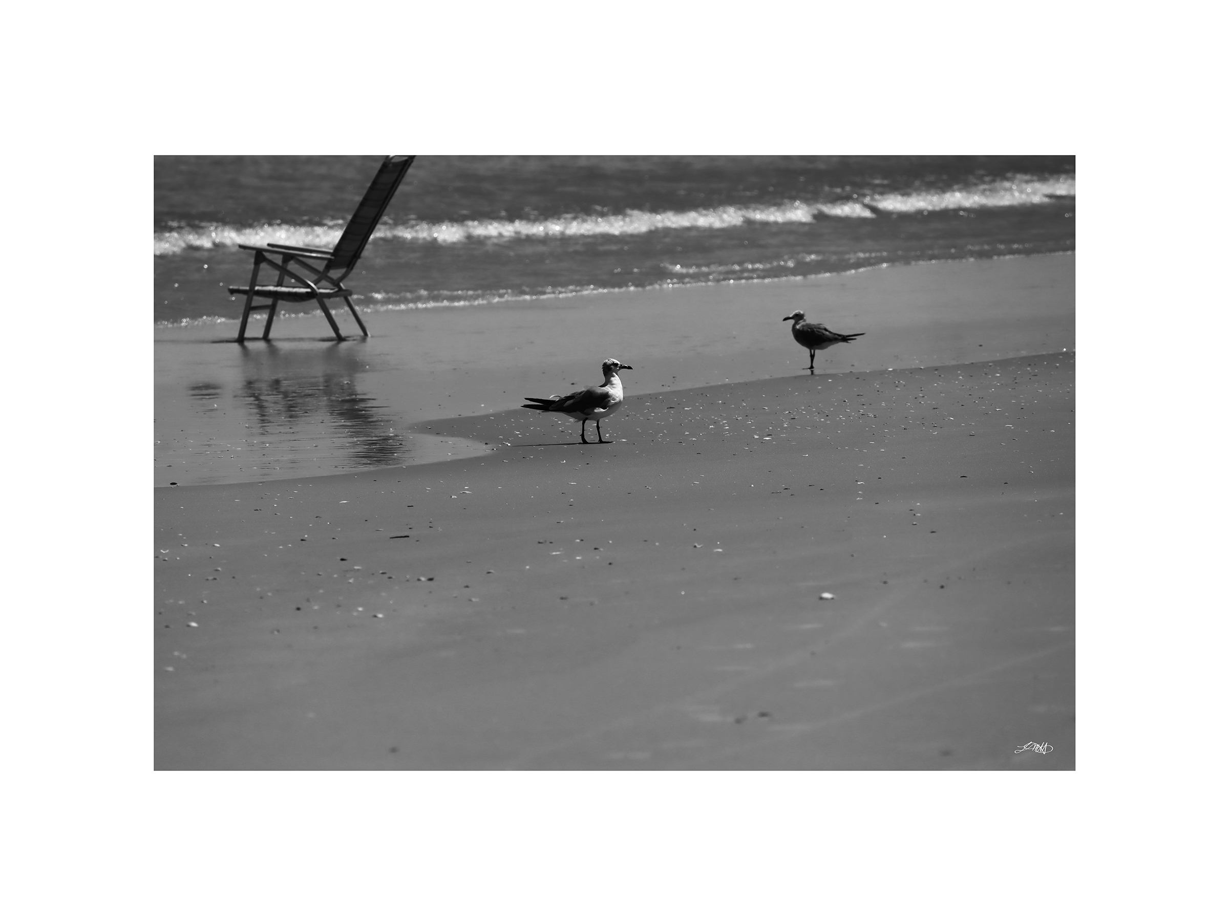 Gulls Standing II shows the beach’s textures around the seagulls facing opposite directions in gray tones.