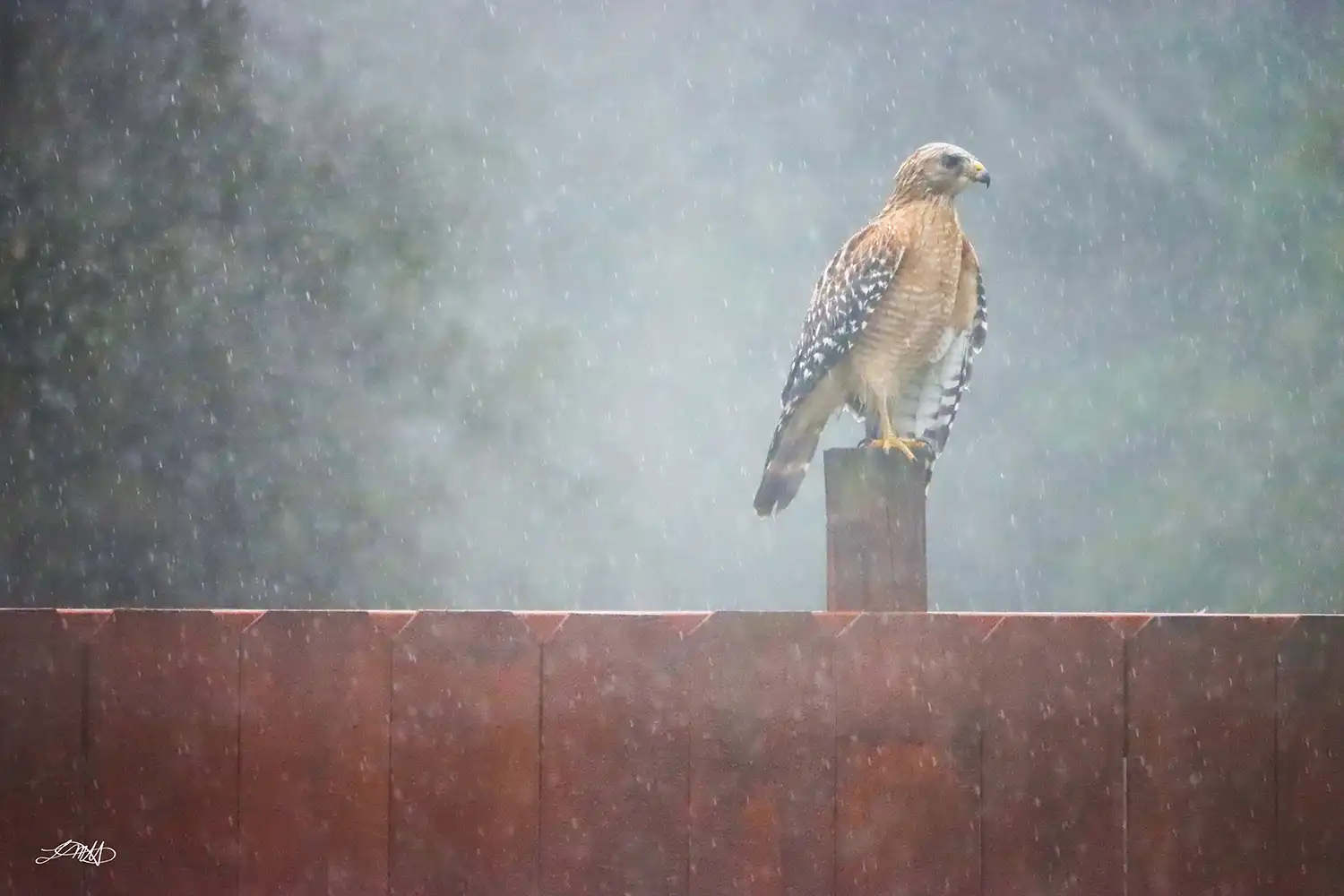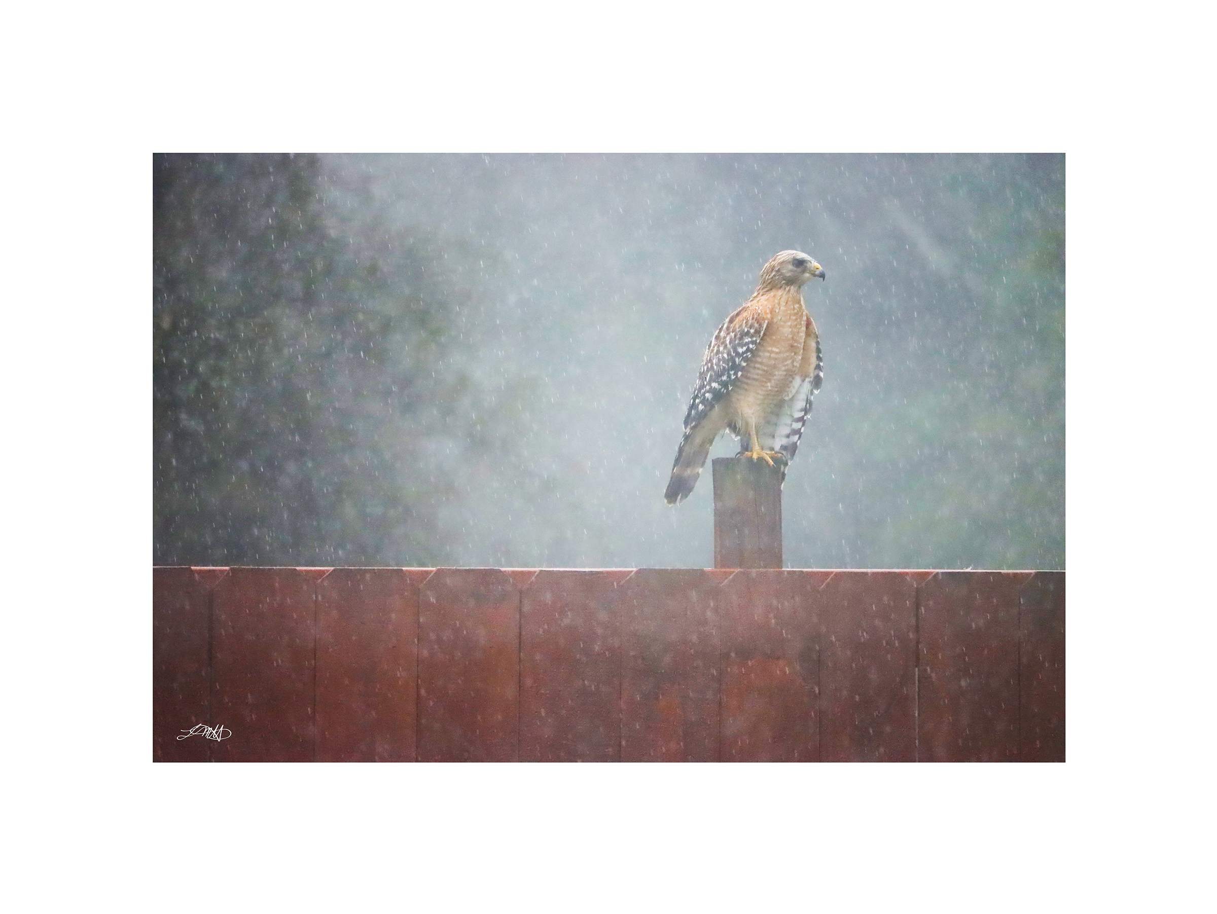 Hawk Profile displays the front of the hawk as it is encircled by the mist and rain.