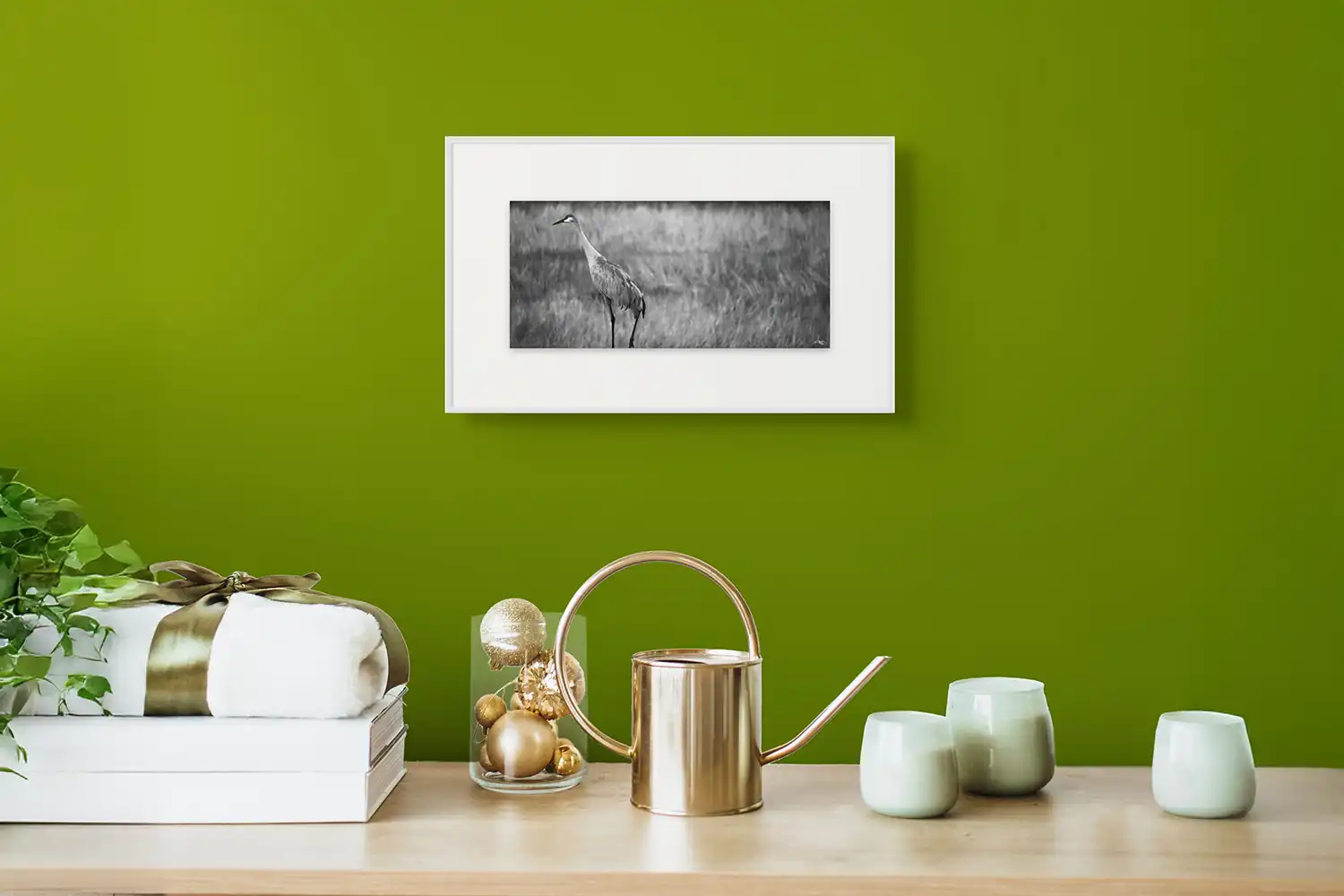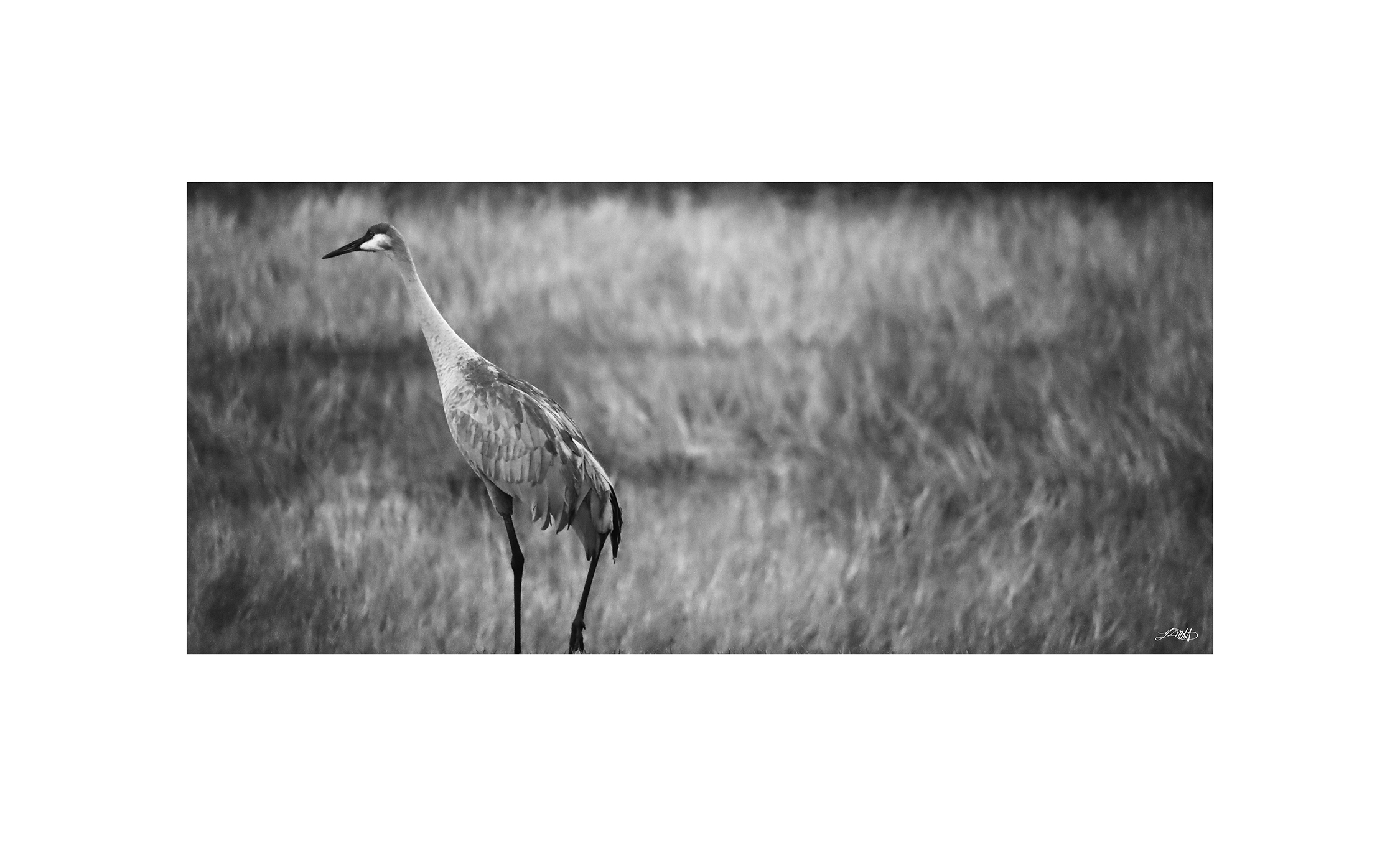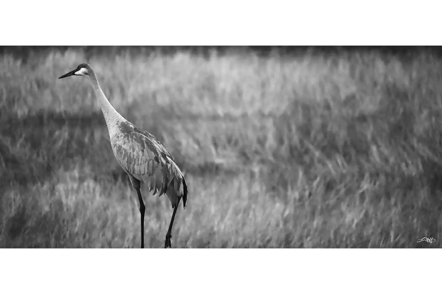 Sandhill Crane Profile II shows the crane’s stance among the waving textures of the grass in gray scale.