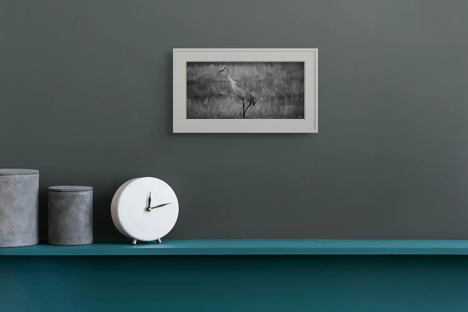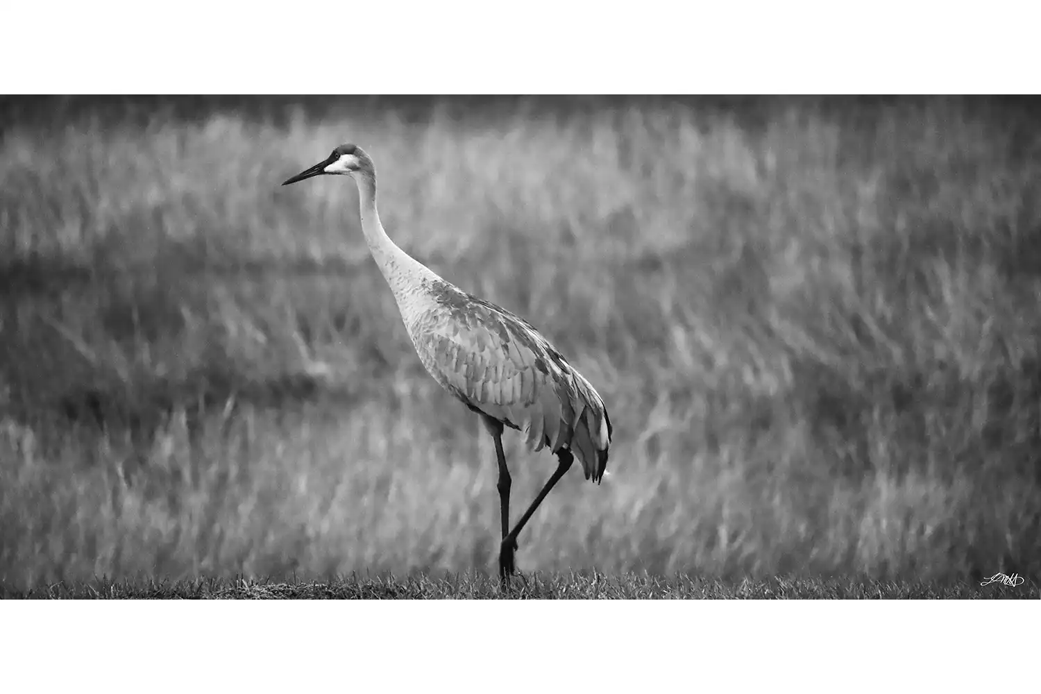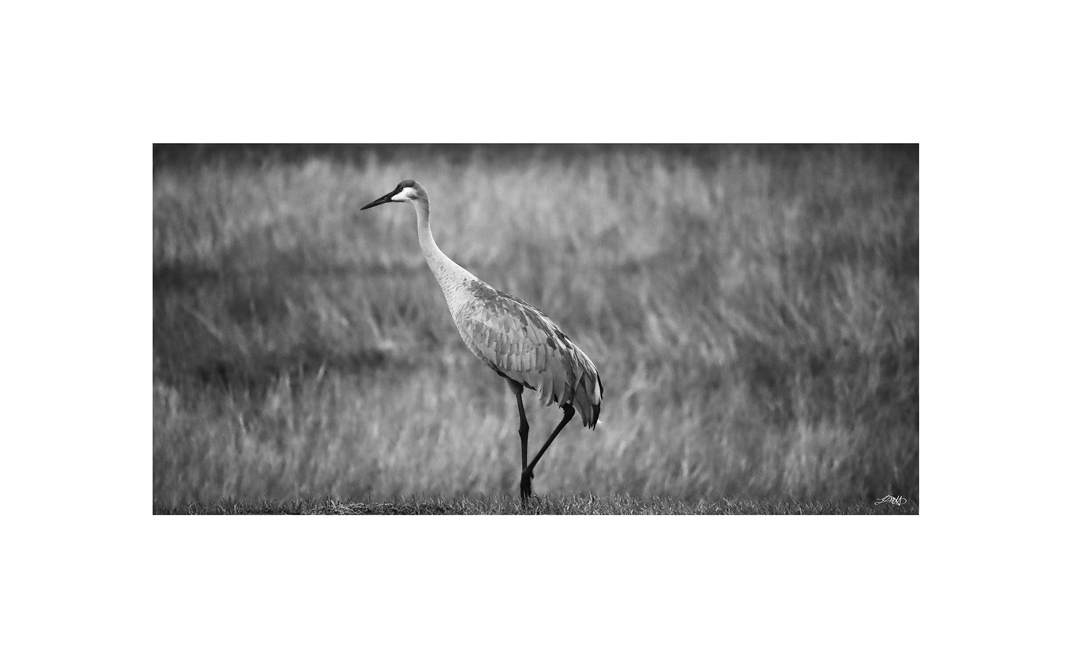 Sandhill Crane Triangle II shows the crane forming a triangle which creates a focal point among the feathers and tall grass.