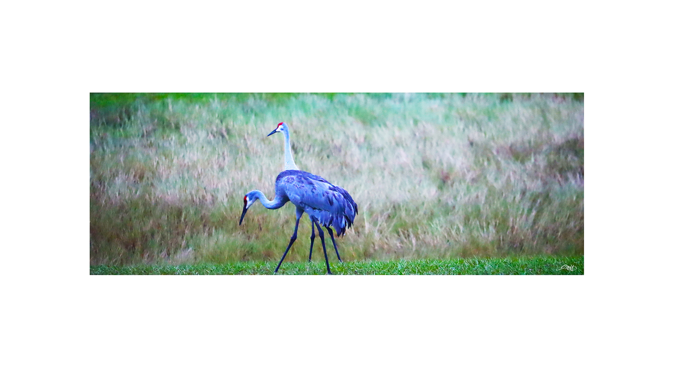 Sandhill Cranes Double depicts a colorful scene of two cranes peacefully enjoying the grass surrounding them.