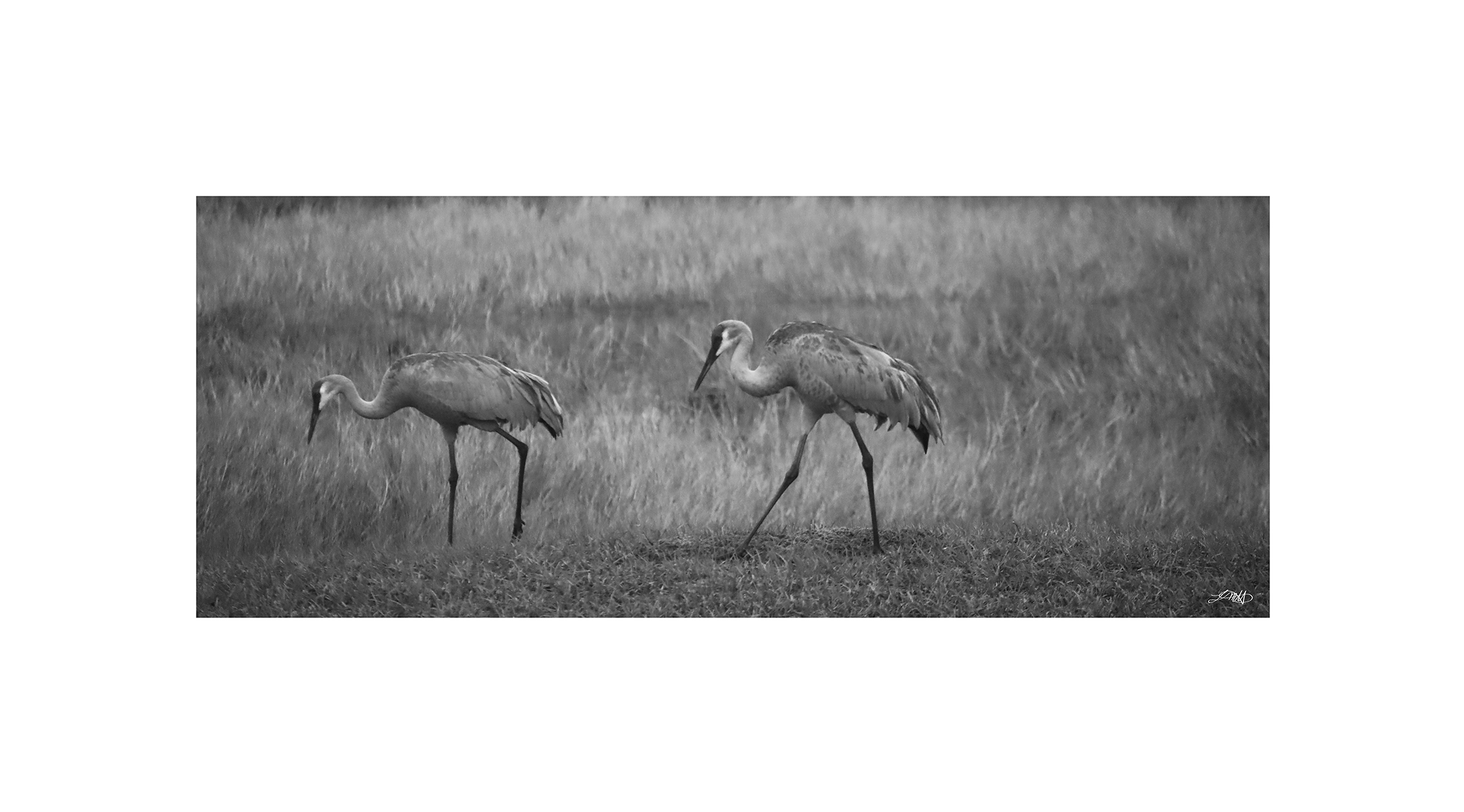 Sandhill Cranes Graze II displays the texture and contrast between two cranes and the grassy field behind them.