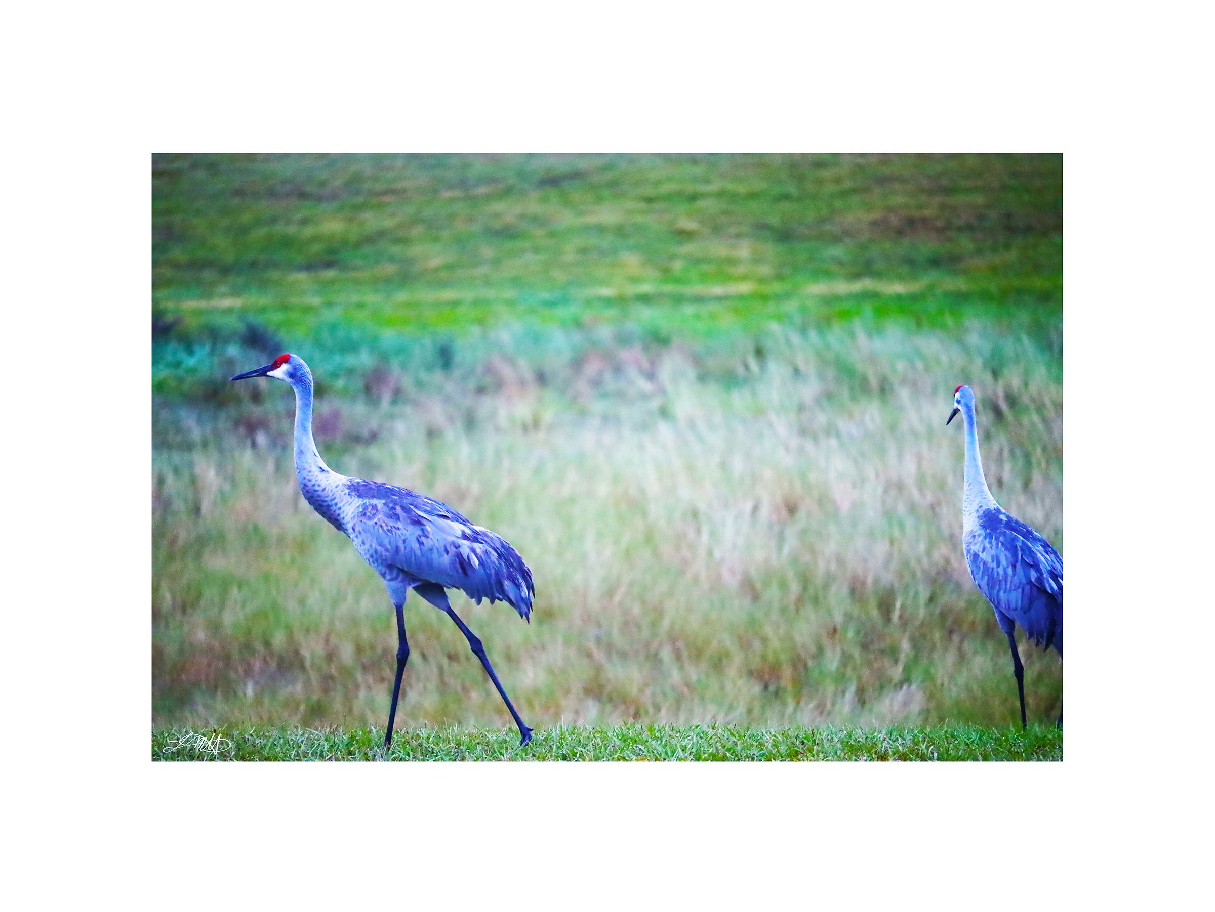 Sandhill Cranes Walking provides a vivid scene of the cranes striding along the grass.